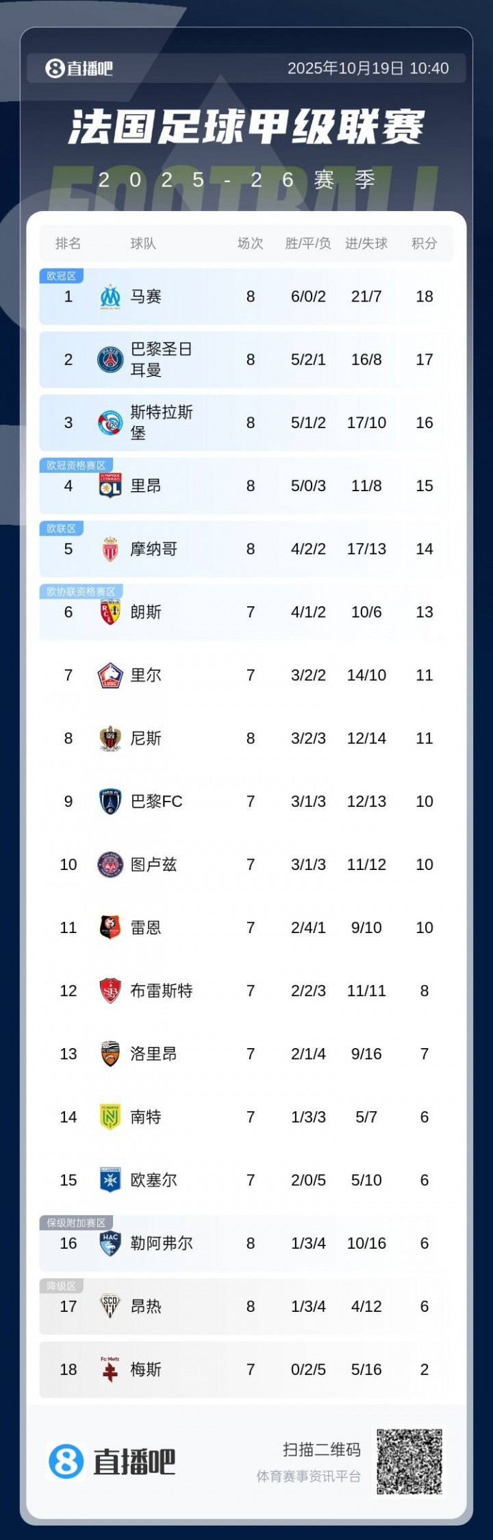 直播吧10月19日讯法甲第8轮,马赛6-2大胜勒阿弗尔,豪取法甲5连胜,登顶积分榜。