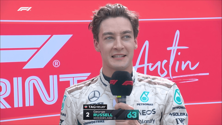 虎扑10月19日讯据F1官方消息,在美国大奖赛冲刺赛中,乔治-拉塞尔借第一弯的混乱局面,从第六位一举跃升至第二位。这位梅赛德斯车手在安全车重启后,于第12弯大胆发起对领先位置的冲击,但未能将赛车控制在赛道范围内。最终他以第二名完赛。