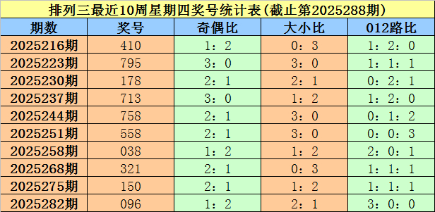 排列三第2025282期(上周星期四)奖号为096。其中奖号奇偶比为1:2,大小比为2:1,012路比为3:0:0。