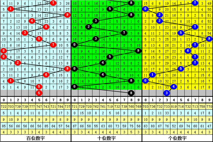 012路分析:最近10周星期四奖号012路总比例为10:10:10,012路号码轮空期数比为3:3:3,上周星期四奖号012路比为3:0:0,本周星期四注意1路号码走冷,看好2路号码热出,参考012路比1:0:2。
